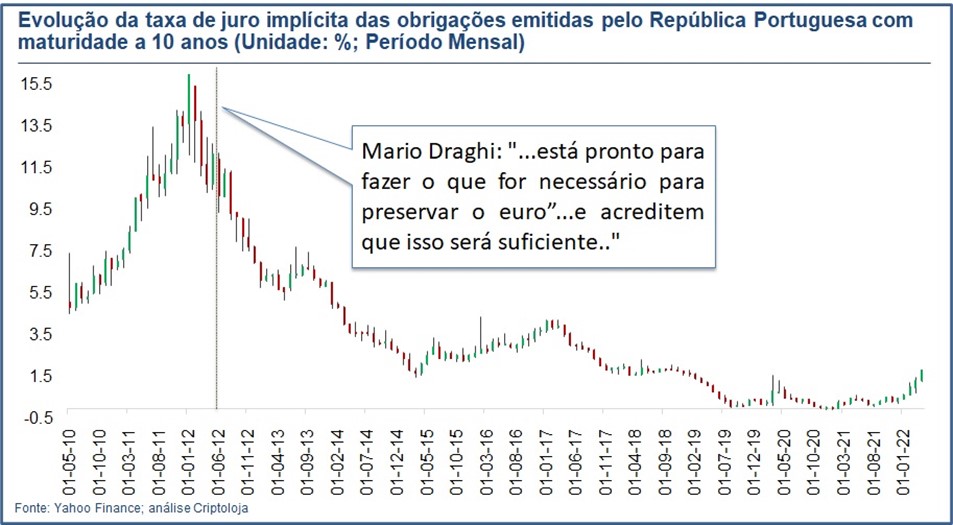 A pressão compradora do BCE provocou a subida do preço das obrigações, levando à redução da taxa de juro implícita. Na mesma figura, podemos observar que no final de 2021, com a subida da inflação, a taxa de juro implícita está a subir consideravelmente, ainda que para já, de forma controlada.