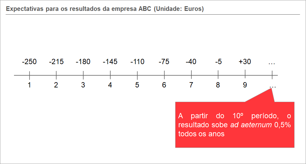 Na Figura 2 podemos ver que no primeiro ano a empresa perde 250 Euros. Ao longo do tempo, espera-se que vá diminuindo as perdas, até que no 9º ano começa a apresentar resultados positivos, passando, a partir daí, a crescer todos os anos a 0,5%.