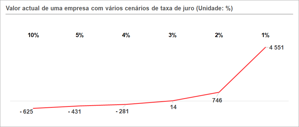 Se descontarmos a 10%, 5% e 4%, trata-se de um investimento não interessante, tal como podemos observar na Figura 3. No entanto, para valores inferiores a 4%, o valor atual passa a ser positivo. Quando se aproxima dos 0%, o valor atual começa a subir de forma exponencial. Trata-se precisamente do fenómeno que acontece com os mercados financeiros da atualidade. Esta a explicação para as valorizações estratosféricas a que assistimos recentemente!