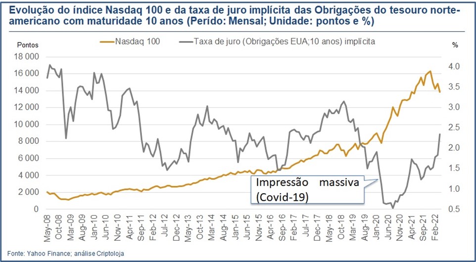 Note-se que a partir do final de 2021, com a subida da inflação – a consequência da enorme impressão de dinheiro durante a crise Covid-19 -, os bancos centrais passaram a estar pressionados para reduzir a impressão massiva de dinheiro e a subir os juros, pelo que o índice Nasdaq 100 não recuperou do máximo histórico ocorrido no final do ano transato, estando em correção desde então.