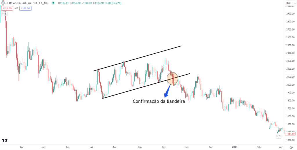 Enquanto uma bandeira de baixa, trata-se de um canal de tendência ascendente, que quando é quebrado em baixa indica uma possível continuação da tendência de descendente.