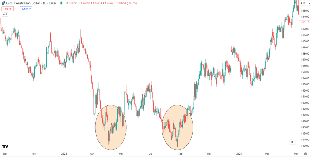 Outra formação gráfica de reversão é o padrão de duplo fundo, que é o oposto do topo duplo. É formado por dois mínimos consecutivos de profundidade semelhante, separados por um pico. Esse padrão indica uma possível reversão da tendência de baixa e sugere que os preços podem começar a subir.