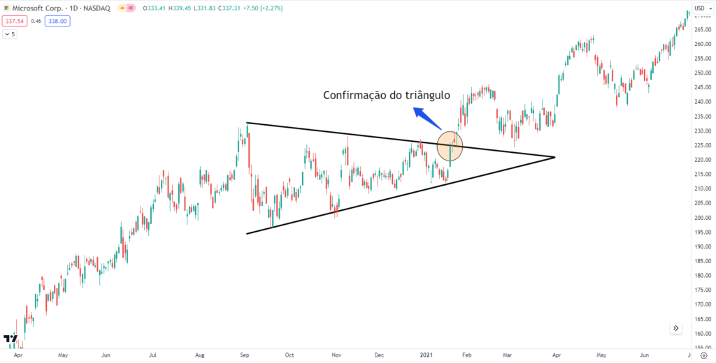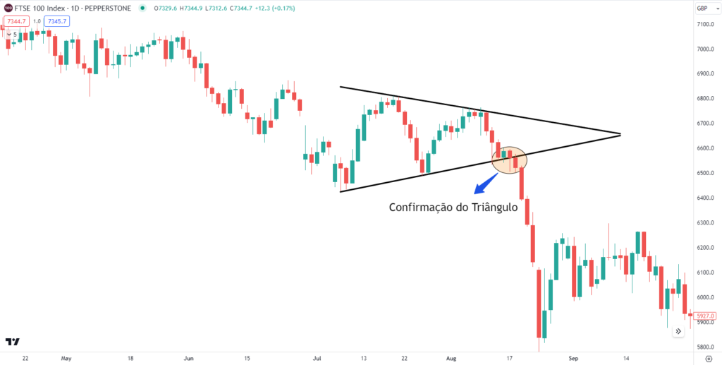 Se a tendência principal for ascendente e no momento de consolidação da tendência se confirmar a formação de um triângulo, a probabilidade é que a tendência ascendente se mantenha.
