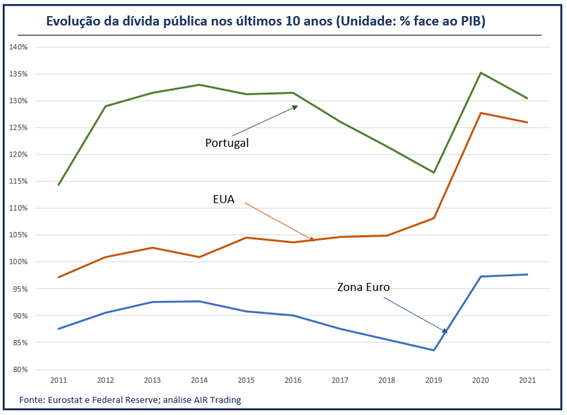 Olhando de forma relativa e face ao PIB, este valor de dívida representa cerca de 126% do PIB americano, 97,7% do PIB da Zona Euro, e no caso particular de Portugal, 130,5% do nosso PIB (a terceira maior da União Europeia), utilizando os dados mais recentes relativos ao terceiro trimestre de 2021.