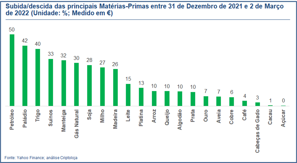 A impossibilidade de comprar Petróleo e Gás à Rússia e cereais à Ucrânia, um dos maiores produtores mundiais, está a provocar uma escalada descontrolada dos preços da maioria das matérias-primas, agravando o problema da inflação que já vinha detrás, em virtude da impressão massiva de moeda pela maioria dos bancos centrais do ocidente.
