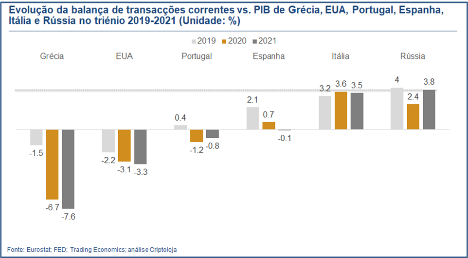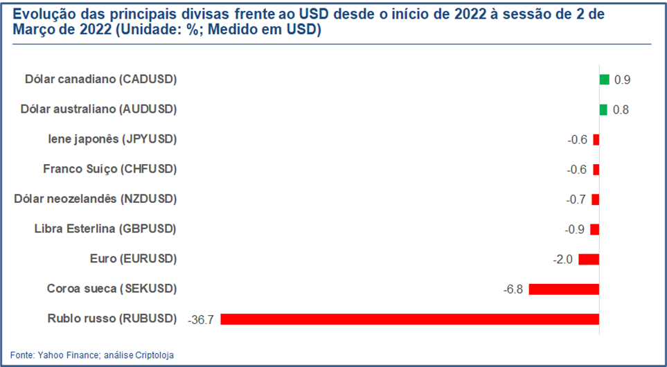 Este movimento é agravado pela desvalorização do Euro: no presente ano regista uma queda superior a 2% em relação ao USD, adicionando-se à desvalorização de cerca de 8% em 2021. O Rublo também se afunda frente ao USD, perdendo mais de 35% no presente ano (ver Figura 2)! Trata-se de um cataclismo para os aforradores russos, que vêem as suas poupanças arruinadas pela desvalorização da sua moeda. Face ao exterior, são agora profundamente pobres!