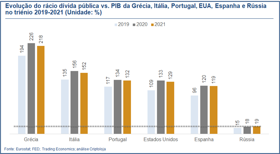 No que respeita ao endividamento público, a situação é um autêntico plano inclinado em direcção a um buraco negro. Os EUA, cuja moeda é a reserva do mundo, quase superam o endividamento público português, em torno de 130% do PIB. Quanto à Rússia? Apenas 19%.