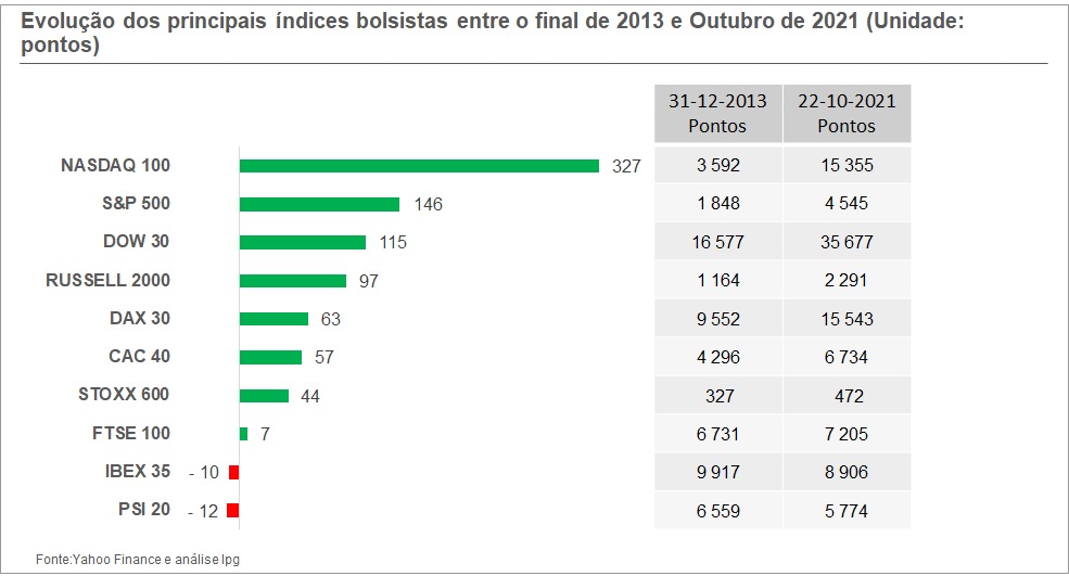 Como podemos constatar, entre o final de 2013 e Outubro de 2021, cada uma das geografias apresentou um desempenho completamente distinto.