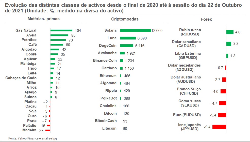 Na Figura 2, podemos consultar a evolução de distintas classes de activos no período compreendido entre o final de 2020 e o dia 22 de Outubro de 2021; os desempenhos são díspares e, em alguns casos, de sentido contrário.