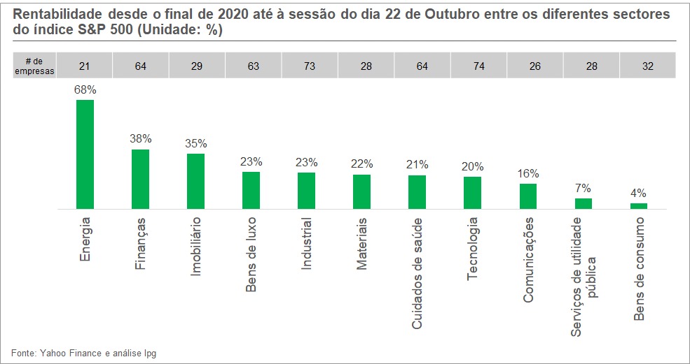 Como podemos constatar na Figura 3, entre o final de 2020 e 22 de Outubro de 2021, as empresas constituintes do índice S&P 500 (sp500) do sector da Energia, utilizando uma média simples, registaram uma valorização média no preço das suas acções de 68%. Esta valorização foi suportada pela subida do preço do petróleo; já o sector de bens de consumo, ainda que apresente igualmente uma rentabilidade positiva, valorizou 4%.