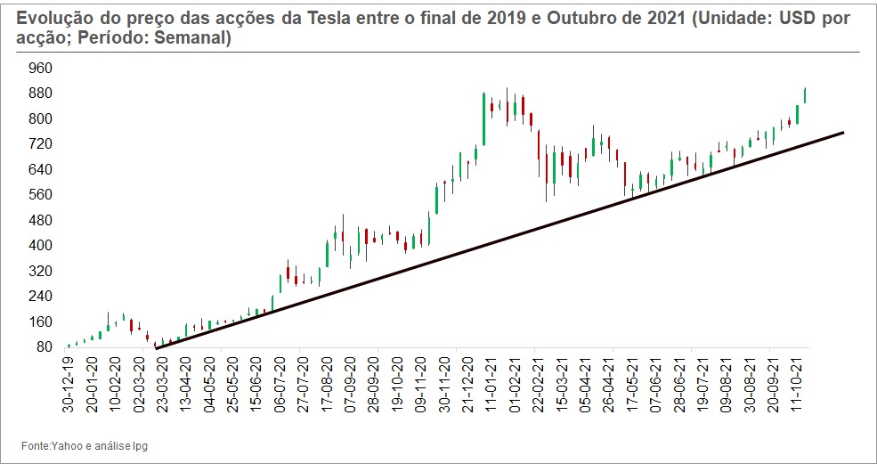 No entanto, numa realidade de taxas de juro 0%, e tal como podemos observar na Figura 4, a Tesla não pára de subir em bolsa: aqui entra a Análise Técnica.